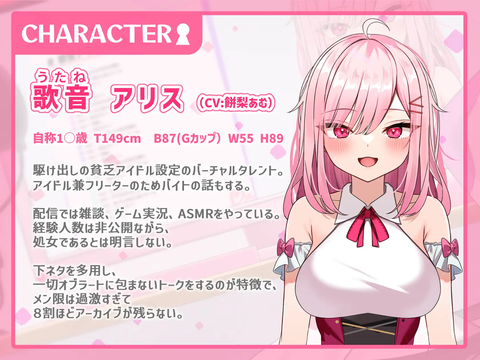 説明: バーチャル配信者の表と裏を堪能しませんか? 下ネタを連発してる配信者の中の人が、 実は恋愛すらしたことがない処女だとしたら......? この作品はそんなバーチャルタレント「歌音アリス」と、中の人「大宮紬季」の表裏のギャップを体感でき、 さらに紬季の心に秘めてるドスケベさを思いっきりぶつけてもらえる作品です。 恋愛処女な紬季があなたに好きになってもらおうと頑張るかわいい姿をお楽しみくださいませ♪(CV:餅梨あむ様)