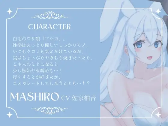 説明: 【ルート選択多数!2時間超】飼育施設から逃げてきた「ウサ娘」のクロミとマシロ。雨の公園で親切に二匹を助けた主人公。社畜貧乏の"ご主人"の狭い部屋に居られるのはどちらか一匹...?!二匹の激しい子作りダービーが今始まる...!子作りルートは「純愛」「拘束」「囁き」「わからせ」「とことん同時責め」等多数!ご主人の子をばこばっこ全力孕みたい!!