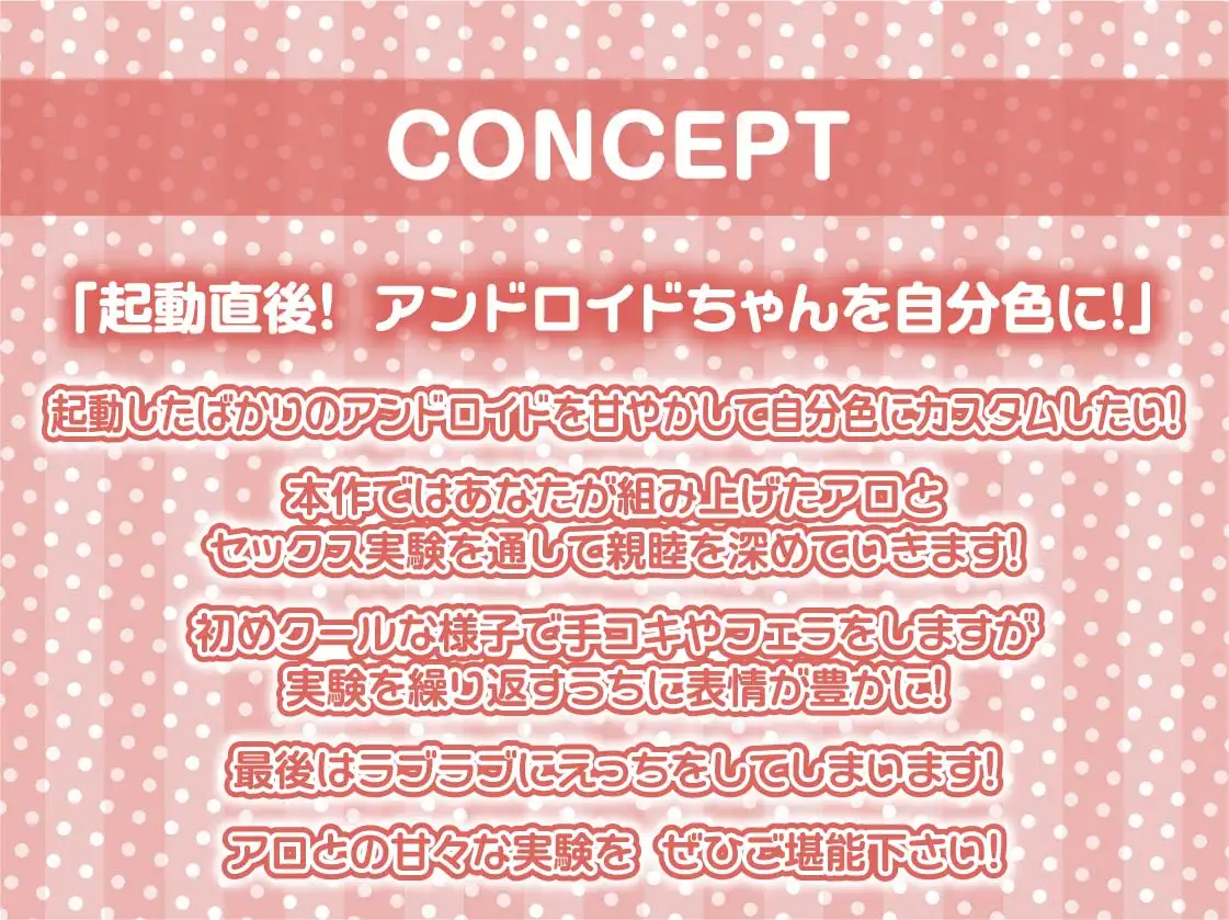 アンドロイドのアロを 起動したあなた... 起動したばかりで 感情はあまり感じないという... 早速アロとセックス実験を することに! クールに手コキやフェラ 生えっちをしてその日は 添い寝するが... アナルやパイズリなどを していくうちに 感情の起伏が大きくなっていき...