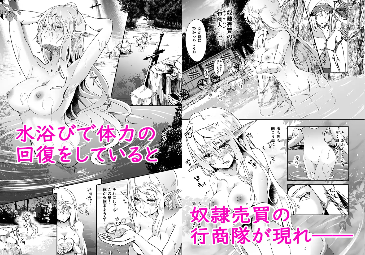 満身創痍で奴○売買組織から逃げ出したエルフのイヨ。泉で回復を図っていた所、とある行商に捕まってしまう。窮地に追い込まれたイヨだったが、行商の男達の性欲処理をすれば仲間を救う協力をしてくれるという...。一糸纏わぬ彼女に選択の余地はなく...