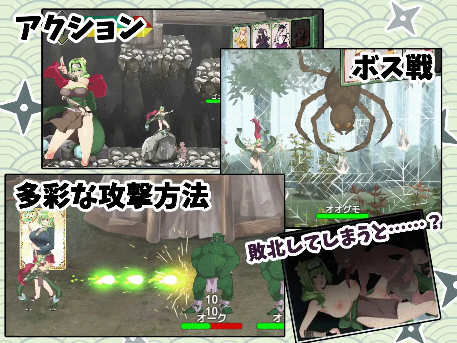 くノ一アル姉ぇがさらわれたケンジくんを助けるために盗賊団と戦うお話。ゴブリン、オーク、オオカミなど多彩なモンスターや相手の盗賊団に負けてしまうとそのまま陵○の限りを尽くされてしまいます。はたしてアル姉ぇはケンジくんを救うことができるのか!?