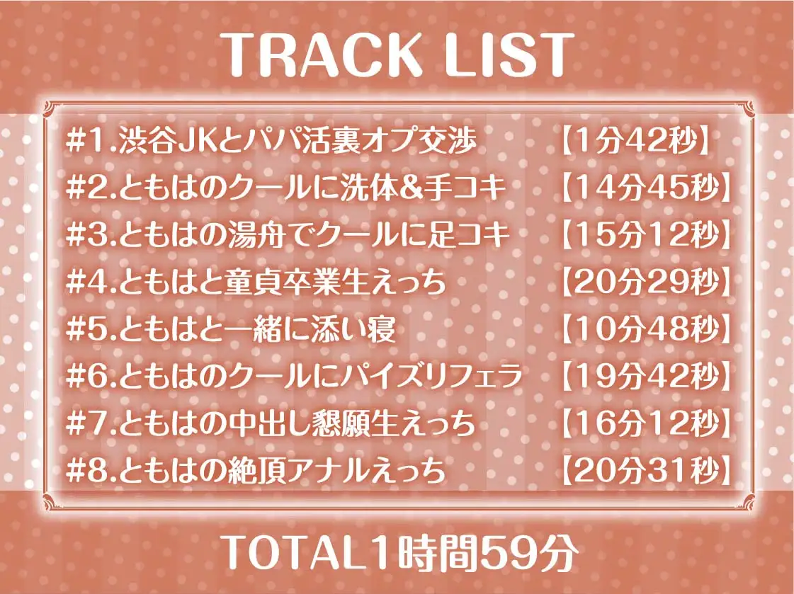 渋谷でスマホをいじっている JKに声をかけたあなた... ともははここで パパ活をしている 女の子だった! クールな性格の彼女と 裏オプまで交渉して ホテルへ行くことに... 早速お風呂で洗体して 手コキと足コキをしてもらう! そしてベッドへ移り 生えっちで童貞を卒業! 少しだけ眠るつもりが 添い寝して目覚めると...