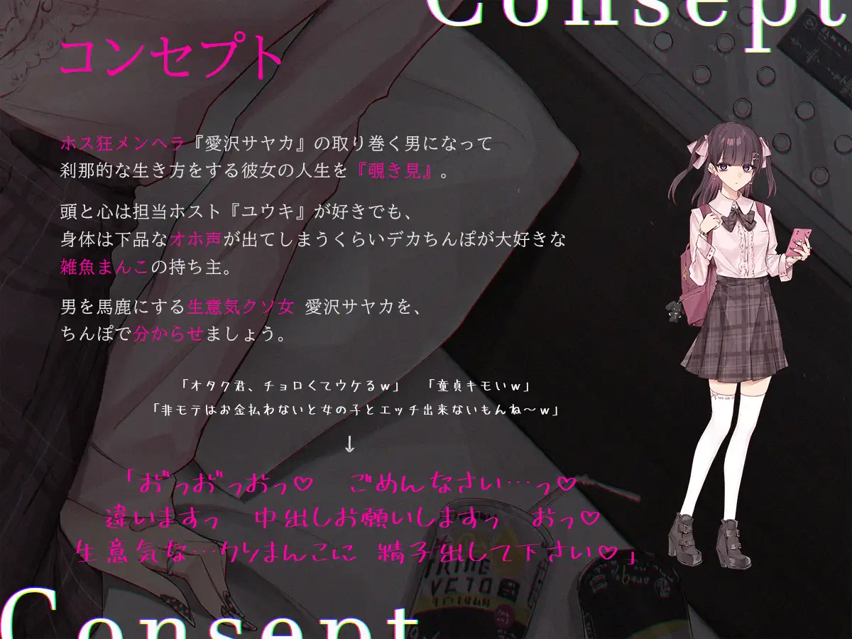 説明: 性格は悪過ぎるが、顔とスタイルだけは抜群なサヤカの日常を、彼女を取り巻くの男達になって"覗き見"しませんか? パパ活と風俗で稼いだ金は全額ホストのシャンパンに消え、オタクや童貞をバカにしまくる地雷系女子。 メンヘラで自傷やODしつつプライドだけは何故か一流。担当ホストが好きと言いつつ、身体はデカちんぽが大好きな煽りマゾ♪ 生意気な癖にオホ声がすぐ出る雑魚まんこを犯してたっぷり中出しで"分からせ"ましょう!! CV堀米玲音