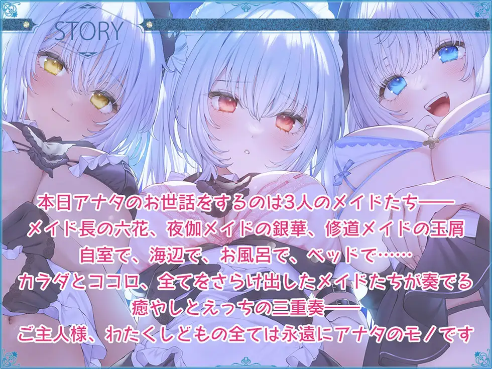 出演:伊ヶ崎綾香さん/天知遥さん/涼花みなせさん 本日アナタのお世話をするのは3人のメイドたち――メイド長の六花、夜伽メイドの銀華、修道メイドの玉屑。自室で、海辺で、お風呂で、ベッドで......。カラダとココロ、全てをさらけ出したメイドたちが奏でる癒やしとえっちの三重奏――ご主人様、わたくしどもの全ては永遠にアナタのモノです。