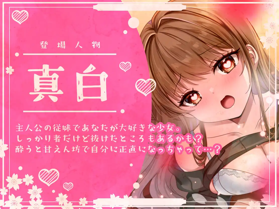 親戚が一堂に会する大宴会 貴方は強い酒を飲みつ飲まれつ酔い潰されてしまう。 フラつくあなたを従妹の少女、真白が心配して介抱してくれる 隅のこたつで二人寄り添い、甘酒とお菓子を食べていると...!? 恋する乙女は酔うと本音が大爆発。 乙女のいちゃらぶ絡み酒でクラクラ確実♪ こたつでこっそり、内緒でえっちなASMR