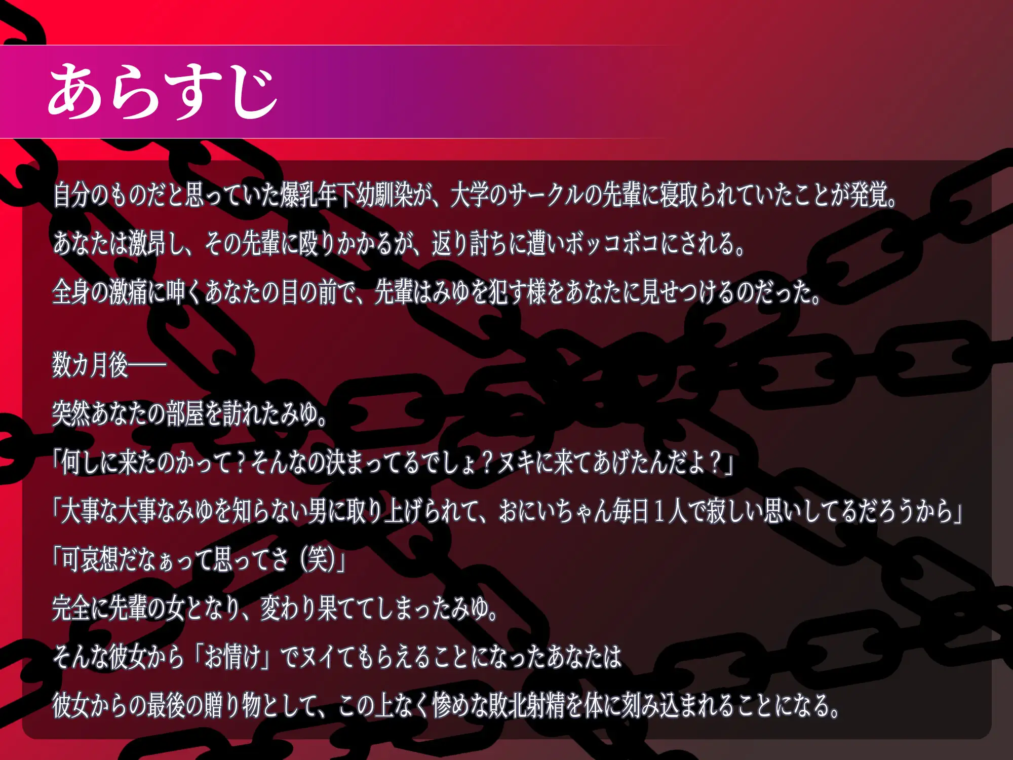 爆乳年下幼馴染が他の男に妊娠確定危険日中出しされるのを見せつけられ、その後完堕ち幼馴染に蔑まれながら惨めな敗北射精をして寝取り男に完全降伏。雄としての完膚なき完全敗北を求める方以外の購入はおすすめしません。