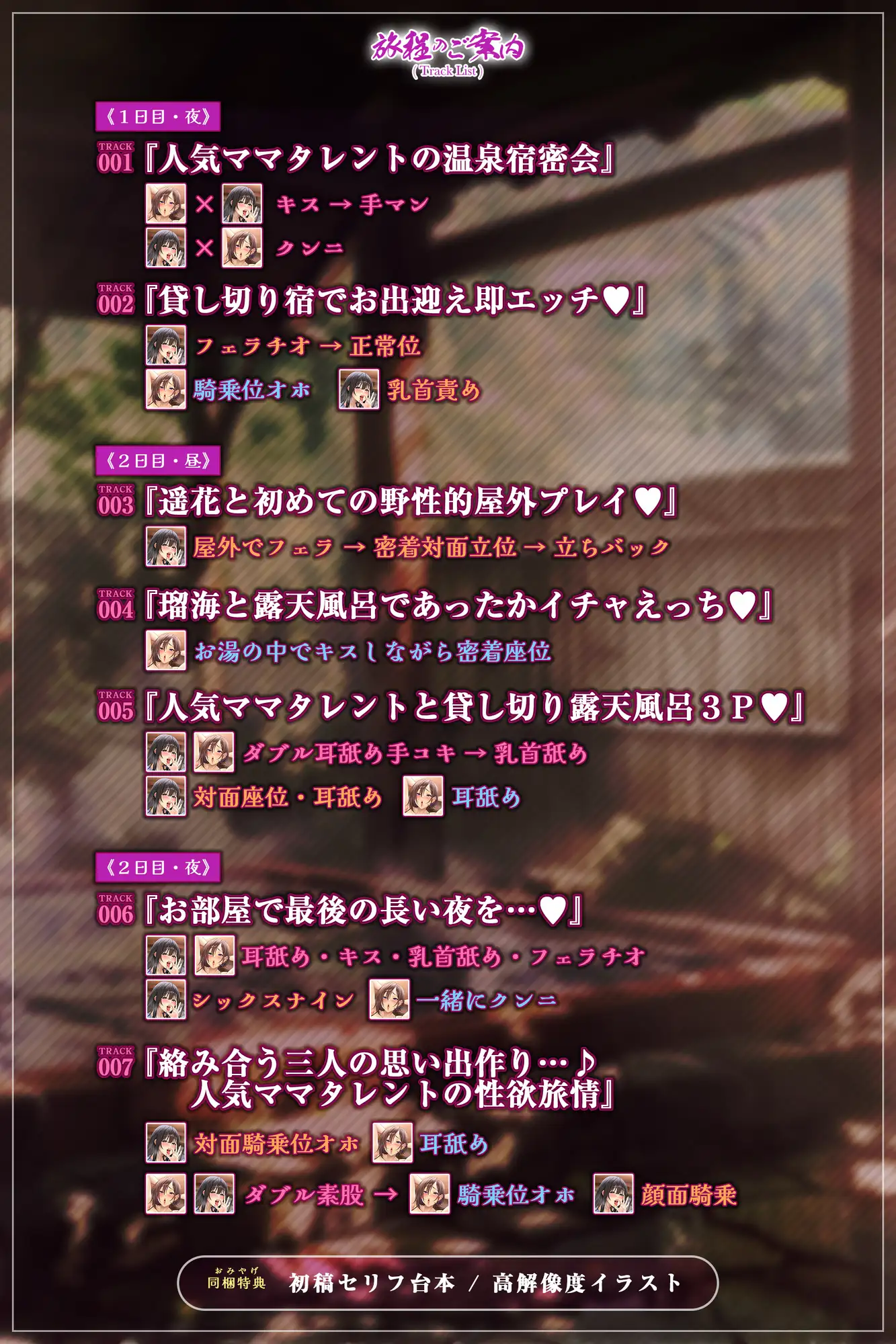 セフレ関係の人気ママタレントと......貸し切り温泉宿で癒されまくりの不倫旅行♪(CV:柚木つばめ様 & 御苑生メイ様)