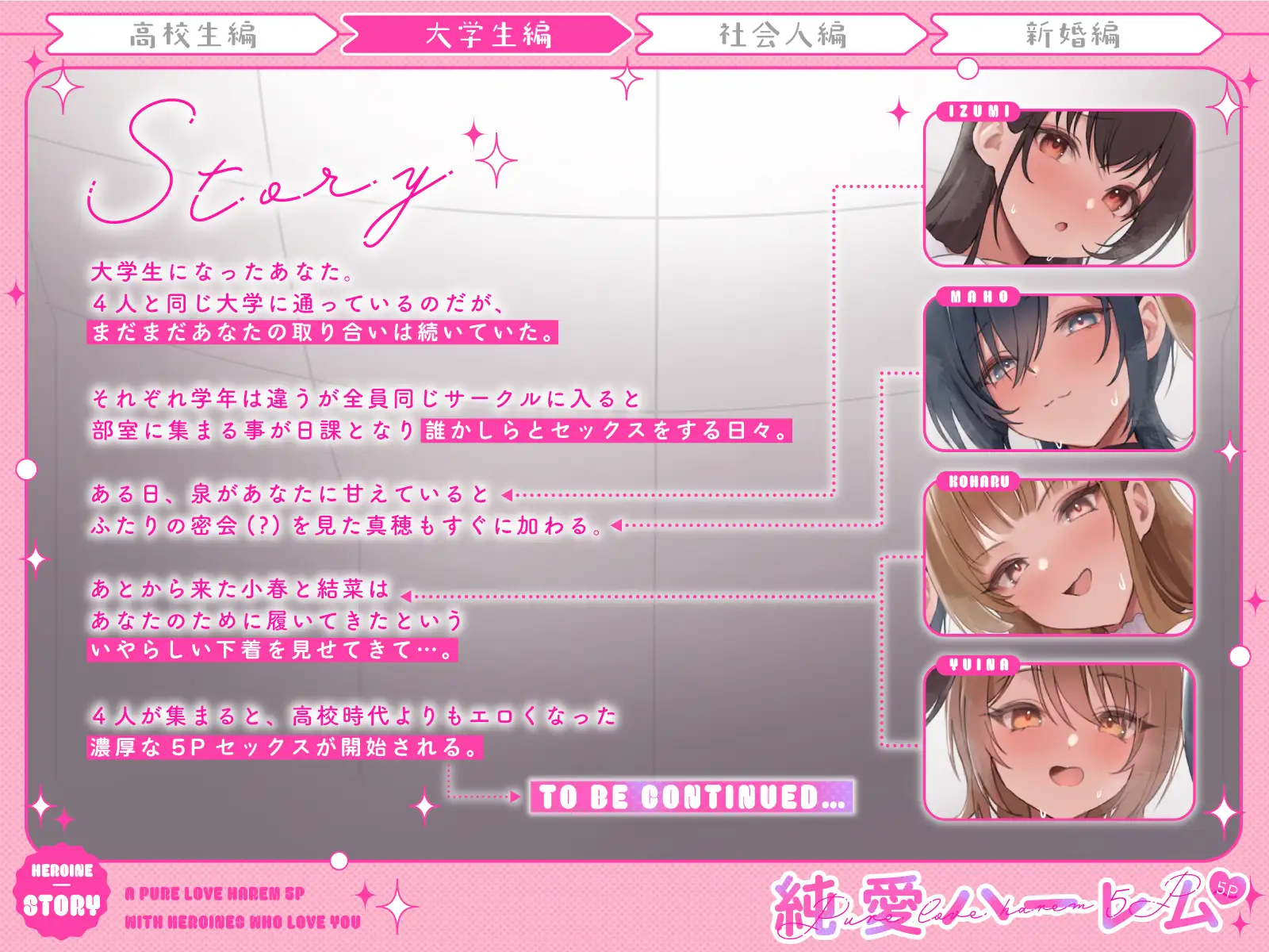 大学生になってもあなたの取り合いは続いていた。全員同じ文芸サークルに入ると、部室ではあなたがいるとエロいことが始まってしまう。以前よりエロくなった4人との甘くて熱いエッチを。