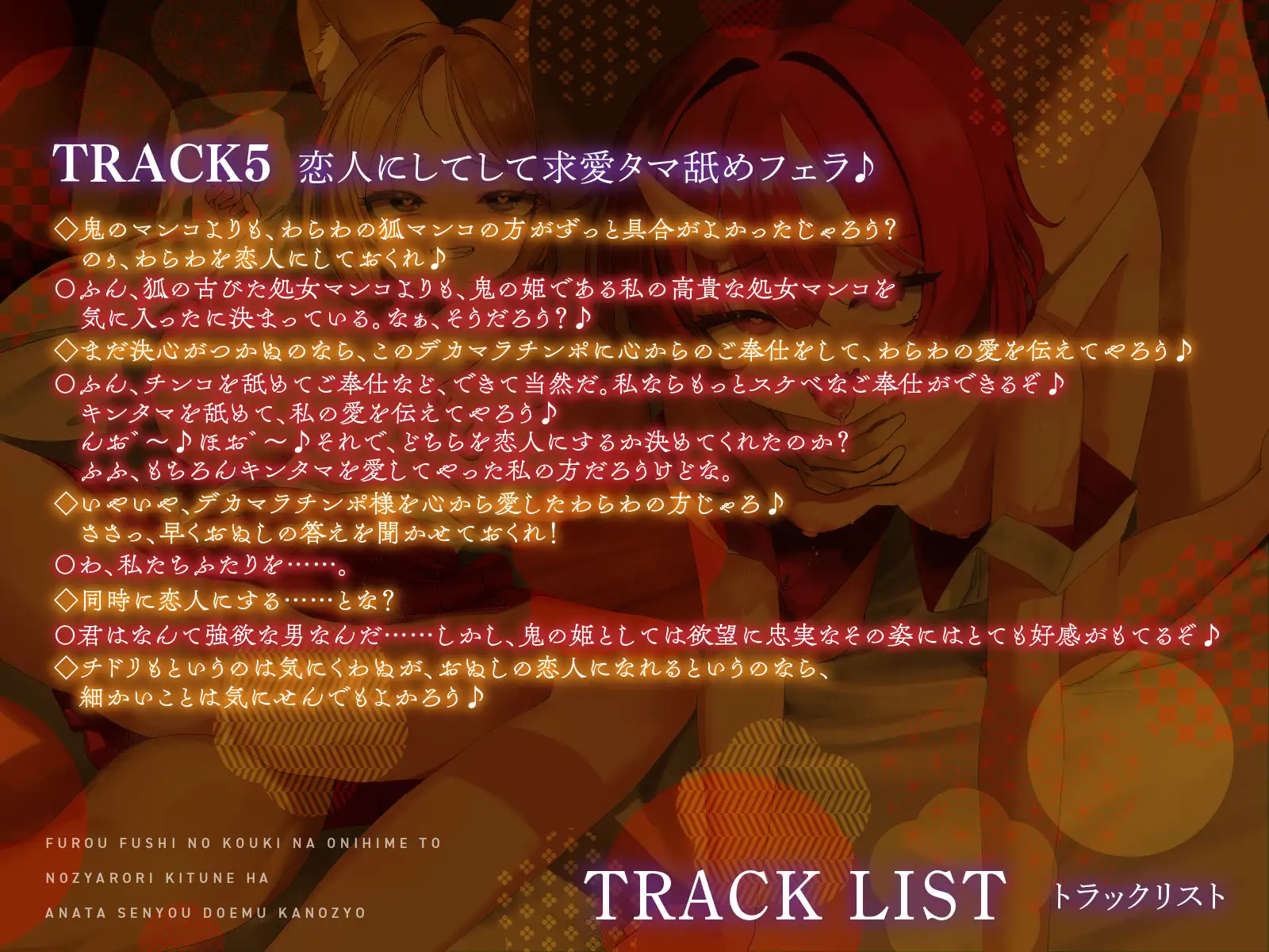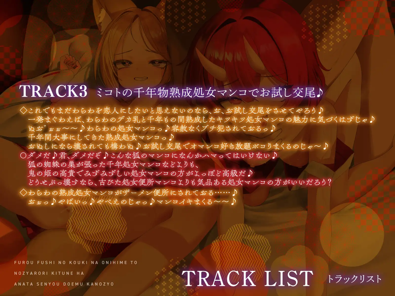 説明: とある神社に祭られた”鬼姫・チドリ”と”のじゃ○リ狐・ミコト”。そんな二人は喧嘩ばかりだけど、二人とも管理人のあなたのことが大好き。あなたの恋人に選んでもらう為、今日もあなた好みのドM媚びを披露する二人。全裸の二人を連れて真昼間から全裸露出プレイを楽しみ、数百年ものの処女マンコを差し出す二人と首絞めセックス。ミコトにハメて、ぐげぇぇ~~♪と鳴けば、直後にチドリをハメてぬごぉ~~♪と情けないオホ声が交互に響きまくる......