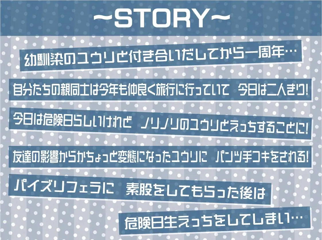 幼馴染のユウリと 付き合いだしてから一周年... 自分たちの親同士は今年も 仲良く旅行に行っていて 今日は二人きり! 今日は危険日らしいけれど ノリノリのユウリと えっちすることに! 友達の影響からか ちょっと変態になったユウリに パンツ手コキをされる! パイズリフェラに 素股をしてもらった後は 危険日生えっちをしてしまい...