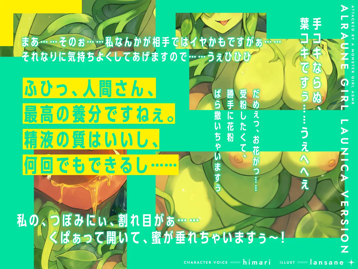 ウツボカズラによる溶解液を使った丸呑みもある!陰キャなアルラウネ娘に襲われるASMR音声作品。あらゆる方法でアルラウネの養分にされてください!モンスター娘を偏愛する折口良乃が原作、シナリオはサイトーマサト、イラストはランサネ、声優はヒマリ。