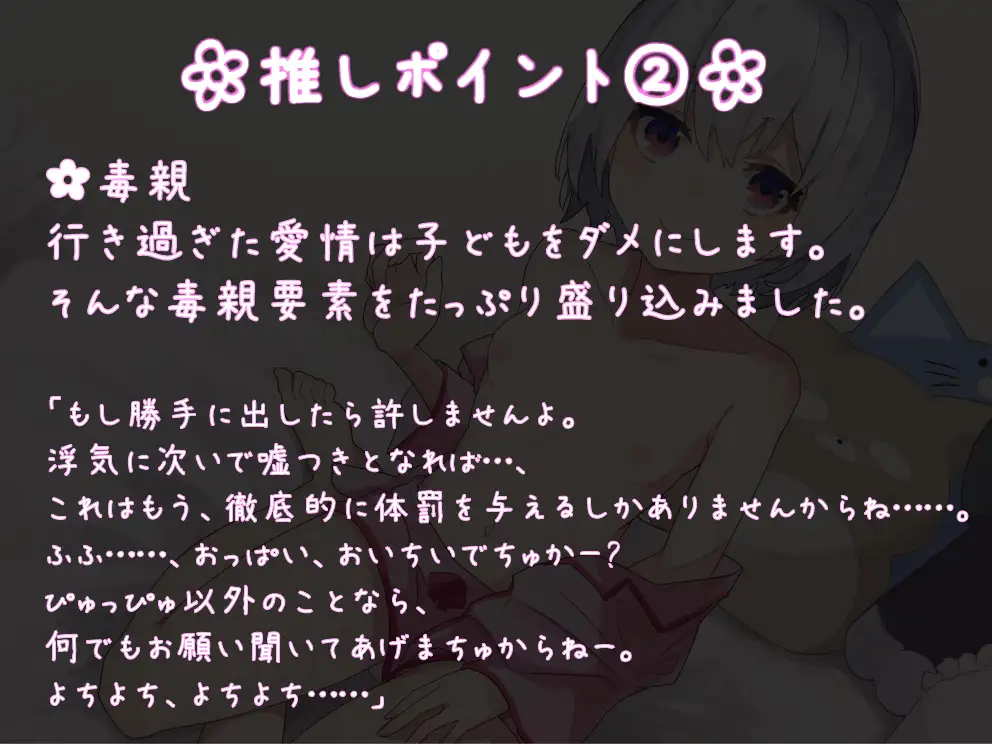 甘やかすだけがママじゃない。 時に厳しく叱ってくれてこそ、本当のママなのではないでしょうか? 本作のコンセプトは「赤ちゃん還り×マゾ堕ち」。「子離れ」ができない過干渉な妹ママに自立を阻まれ、依存させられ、赤ちゃん還り状態のまま射精管理される......そんな倒錯したママ音声です。