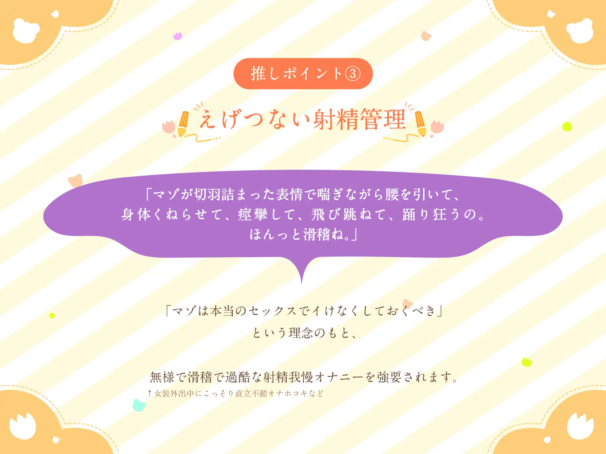 保育園で赤ちゃん扱いも良いけれど、幼稚園で先生に見守られながら成長するのもまた一興。本作は、貴方の「立派な大人マゾ幼児に成長したい」という心理につけこまれ、2人の先生からあまあまだけど容赦ない「教育」を受ける射精管理音声です。