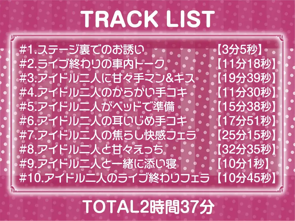 ライブ終わりの ステージ裏... 担当のアイドル あすかとナナカに 誘われて プロデューサーの 自宅でえっちを することに! お互いを求めあう ラブラブなえっちが始まって...