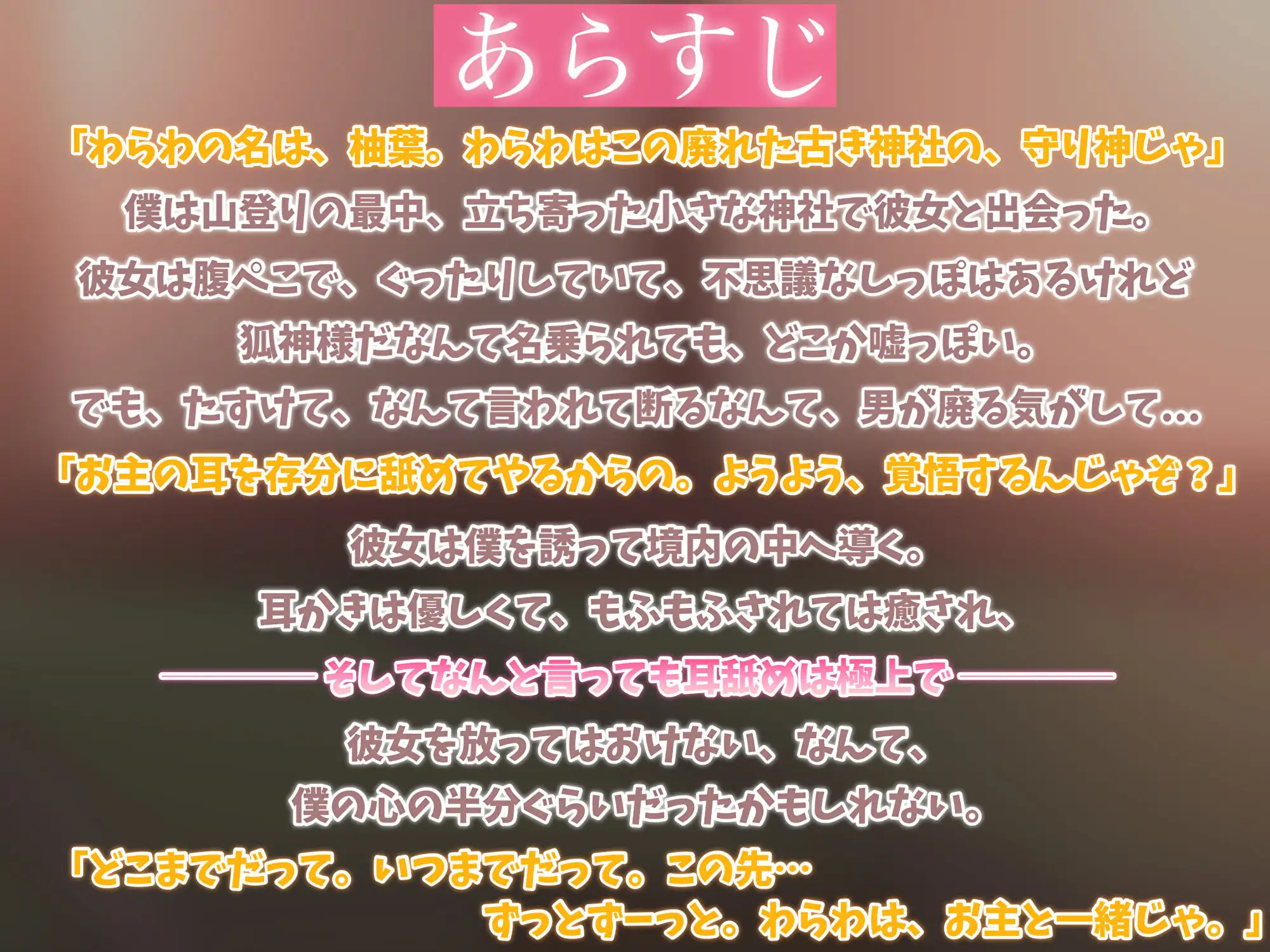 説明: 「わらわの名は、柚葉。この廃れた古き神社の守り神じゃ。」 僕は山登りの最中、立ち寄った小さな神社で彼女と出会った。 彼女は腹ペコで、ぐったりしていて、不思議なしっぽはあるけれど 狐神様だなんて名乗られても、どこか嘘っぽい。 でも、たすけて、なんて言われて断るなんて、男が廃る気がして... 「お主の耳を存分に舐めてやるからの。ようよう、覚悟するんじゃぞ?」 彼女は僕を誘って境内の中へ導く...