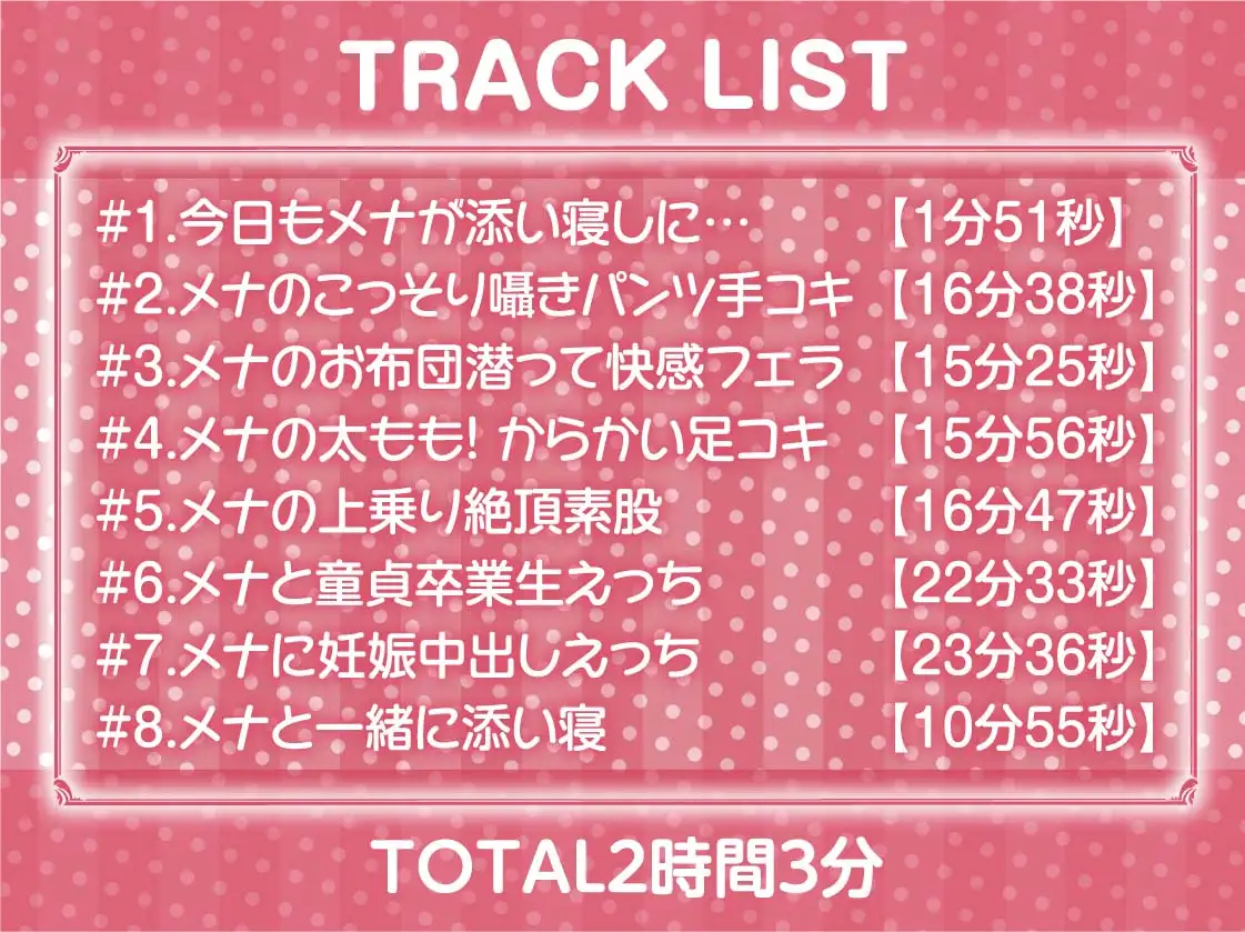 今日も添い寝をしに ご主人様の寝室へ メイドのメナは お布団に入ると ご主人様を甘やかす 二人で密着して ばれないように囁いての 秘密のこっそりえっち 手コキにフェラ 足コキに素股... ついには ラブラブなまま 生えっちも...