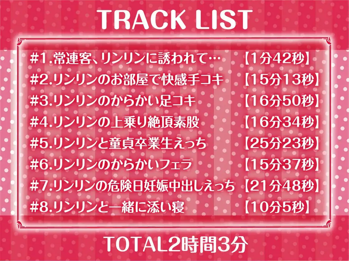 とある中華屋さんの 看板娘リンリン... 常連客であるあなたは リンリンに彼女が目当てで あることを見抜かれて 裏のリンリンの部屋で 特別なサービスを受けられることに! 手コキに足コキに素股に 童貞卒業生えっち! 後日危険日妊娠中出し えっちもしてしまい...
