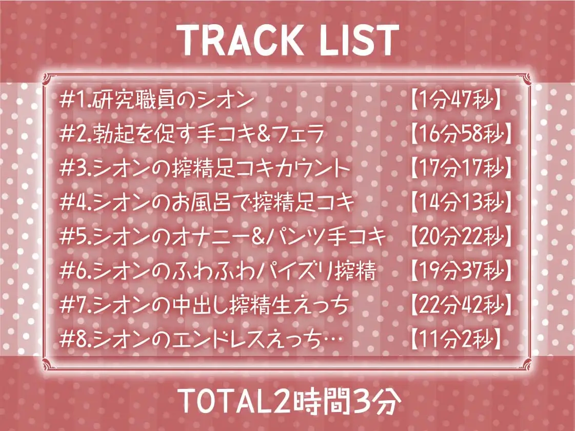 とある研究室... あなたが寝ているベッドの横に 一人の女性シオンが現れる 彼女は研究職員で 研究材料のあなたから 搾精をするとのこと! 手コキやフェラに足コキと あらゆる手段で責められ イカされ続けて...